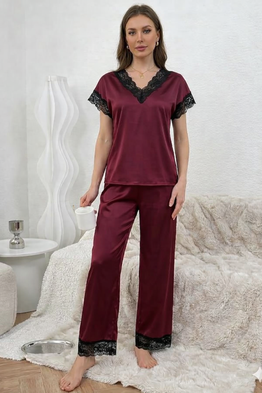 Delicate lace accents on the neckline, sleeves, and pant hems add a feminine and sophisticated touch. - Relaxed Fit Design